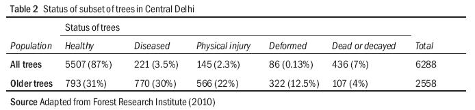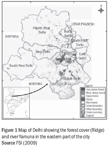 By 2030, five billion people (58%) will be living in cities (UNFPA 2007) and over 575 million (41%) of India’s population will live in urban areas (UNDP 2009). Thus, while the pace of urbanization in India is relatively slower, it will still account for 11.5% of the global urban population. From 1971 to 2001, the urban population of India had more than doubled from 109 to 285.35 million 3 (27.8%), and that of Delhi had almost quadrupled from 3.6 to 12.9 million (Economic Survey of Delhi 2008–09). Although the projected growth rate is not as high, the UN estimates that Delhi will further double its population to about 28 million by 2025. It is not simply the scale that is staggering, but the implications. Delhi, one of India’s most water-scarce cities, has a per capita water usage (255 litres). Greater than that of London (161 litres); groundwater in Delhi, according to the Delhi Groundwater Board, is overdrawn by 190 million cubic metres annually. Only 10% of the daily generation of 20 million cubic metres of sewage is treated, allowing the rest to pollute ground and surface water (Chaudhary, Jacks, and Gustafsson 2002). The rapid decline of previously abundant urban wildlife, such as the House Sparrow (Passer domesticus), is inadequately explained and requires more research (Harvey, Devasar, and Grewal 2006; Khera, Das, Shrivastava, and Jain 2009). Delhi is regarded as one of the greenest capitals in the world with 21 m 2 of green space available per capita. According to the Delhi Human Development Report (2006), the quality of the environment has improved, particularly that of ambient air pollution. Another achievement has been the increase in tree and forest cover 4, from 16 km2 in 1990 to about 268 km 2 in 2001. Delhi’s natural capital primarily includes 7777 hectares (ha) of protected Ridge forest, 5 and the river Yamuna, along with its rich alluvial floodplain, flowing through the eastern part of the city (see Figure 1). The tree cover in Delhi is 11% and the forest cover accounts for 8% (MoEF 2005) but there is minimal official monitoring or measuring of biodiversity in the city. Megacities inevitably outgrow their infrastructure leading to congestion, encroachment, and resource pollution. The river Yamuna, which runs through Delhi, has been choked by sewage, hospital waste, and industrial pollution. Delhi generates 3296 million litres per day (MLD) of sewage, half of which flows untreated into the Yamuna (WaterAid India 2005). Delhi has about four hundred water bodies, most of which have been degraded or encroached (MoUD 2007). Most of Delhi is serviced by canal water; however, there is a shortfall of about 1290 MLD. 6 The city relies on large hydropower projects for its municipal water supply such as the controversial Tehri dam and Renuka dam that are strongly opposed by civil society. 7The Ridge forest has shrunk from occupying 6.69% of the city’s total area in 1992 to 5.52% in 2004 (Figure 2) due to illegal quarrying and construction. The same map shows a disappearing Yamuna floodplain. Urban conditions are tough on street trees, especially those that are already aging. Trees suffer from limited root space, air and water pollution, nutrient-deficient soil, toxic chemical use, soil compaction, underground cables, and injuries to trunks and branches by hanging nails and boards. Trees often die or get affected by diseases well before reaching maturity. Older trees in Central Delhi fare worse than those in the rest of Delhi (see Table 2). Water supplied by the Yamuna has been declared unfit for irrigation of urban trees (FRI 2010). This degradation of urban biodiversity and natural capital has a direct and indirect impact on the health and well being of local residents. Worldwide studies list several benefits of urban natural capital (primarily forests) including increased groundwater, less water pollution, improvements in air pollution, flood control, erosion control, noise reduction, and energy savings by reducing the urban heat island effect (IADB 1997; Akbari, Pomerantz, and Taha 2001; Jim and Chen 2008; Manning 2008). At least 640 hectares of the south-central Ridge have been declared a protected water recharge zone. Fam, Mosley, Lopes, Mathieson, Morison, and Connellan (2008) list several benefits of urban green space on health and obesity and recommend that irrigation for healthy trees is important even during periods of drought. A recent study by the American Chemical Society shows that even five minutes of exercise in natural surroundings can have positive effects on one’s health and mental well being (Barton and Pretty 2010). Green areas with water seemed to provide additional benefits. Other benefits of urban natural capital include provision of food and fodder, as well as the beautification of the city. A former sanitary landfill in Delhi was converted into a horticultural garden. 8 Street trees function as a green network that can serve recreational and ecological needs by creating sheltered public spaces, managing rainwater runoff, and creating corridors for urban biodiversity. The value of biodiversity has been highlighted for ecosystem functioning and resilience (IUCN 2008). A slight ambiguity arises while defining urban biodiversity and the quality of urban natural capital. It could be argued that urban biodiversity includes not only indigenous flora and fauna but also domesticated species that have adapted to the area and function well in a human ecosystem (Gyllin 1999). This is a reasonable assumption, provided the introduced species do not unduly interfere with the functioning of the ecosystem and hamper native biodiversity. There are several examples of this within Delhi; the Tamarind tree (Tamarindus indica) was introduced from East Africa prior to the 2nd century and now flourishes in the southern and eastern parts of the city (Krishen 2006). Initially, it is unclear whether introduced species will become invasive or harmful for the environment. 
