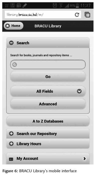 In 2013, BRACU library successfully completed mobile library website project (http://library.bracu.ac.bd/m), which includes information, such as library hours, new events and news archive, links to My Account and My Athens login, library’s catalogue, repository items, and links to important features of our library site (Figure 6). Mobile applications can support learning by making library resources more ubiquitous by bringing new users to the library through increased accessibility to the resources libraries offer, and by creating new ways to enhance connections between patrons and libraries (Griggs, Bridges, and Rempel 2009).