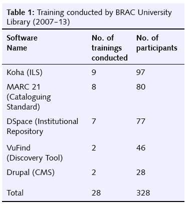 It is perceived that librarians, especially academic librarians in Bangladesh, are facing professional challenges due to the rapid technological changes with the development of information technologies (Mathew, Baby, and Pillai 2010). Professional development training is a means of addressing these challenges but, more importantly, it is a tool to enable staff to update their skills continually, essential in a continuous changing environment (Oldroyd 2004). Having identified the challenges faced by the 21st century academic librarian due to changes in roles from traditional to digital resources (Ross and Sennyey 2008), BRACU library has conducted several workshops and training programmes on Koha, MARC 21, DSpace, VuFind, Drupal, etc., for increasing capacity building for library professionals working in other university libraries (public and private) and to prepare the next generation of librarians in Bangladesh. A total of 328 librarians have been trained from 2007–13 (Table 1).