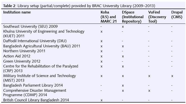 Despite professional development training, BRACU library team assisted a good number of private and public universities directly to implement digital library initiatives in Bangladesh as part of capacity building. Table 2 presents a list of such institutions.