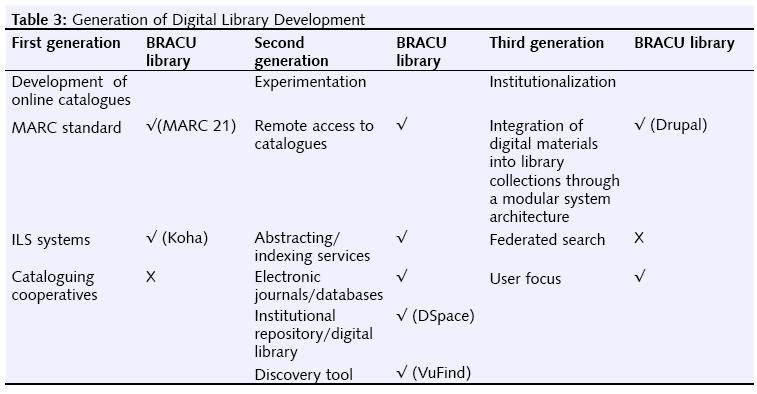 The projects implemented by BRACU library may be categorized as first, second, and third generation of digital library development (Greenstein, 2002). These are shown in Table 3.