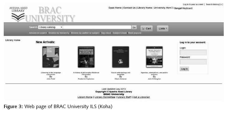 Koha provided an opportunity for library staff to enhance their duty performances up to the international standards. Library patrons of BRAC University can now perform online catalogue search, renewals, hold and look at enriched contents from Amazon.com such as book jacket images, reader reviews, and can also select full chapters (Afroz 2010).