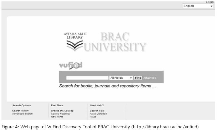BRAC University is one of the committed private universities in Bangladesh to offer education of international standard in the country. Hence, the university needs a modern library to support academic and research activities. The vision of BRACU library was to develop a 21st century world-class Knowledge Resource Centre and provide innovative services and collections to the teaching, learning, and research communities of the University. The library employs the latest technologies to improve services and to provide fast and easy access to information. It meets its goals by integrating appropriate technologies with skilled and experienced staff committed to customer service (Afroz 2010). In the past few years, BRACU library has implemented a number of projects towards its vision and consequently its staff has acquired considerable expertise for their own use, to help other libraries build capacities, and assist other universities in Bangladesh embarking on similar projects, such as Integrated Library System using Koha (http://library.bracu.ac.bd/opac), Institutional Repository using DSpace (http://dspace.bracu.ac.bd), Discovery Tool using VuFind (http://library.bracu.ac.bd/vufind), Content Management System using Drupal (http://library.bracu.ac.bd ), BRACU Library’s Mobile Interface (http://library.bracu.ac.bd/m), etc.