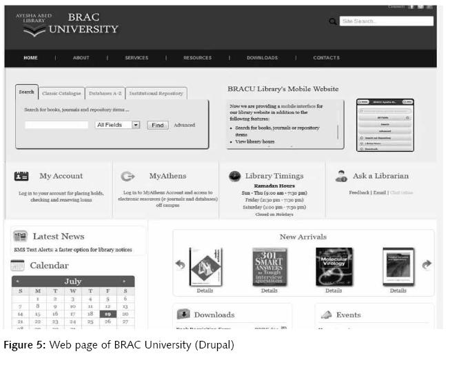 In 2012, BRACU library has successfully completed its Drupal-based library website (http://library.bracu.ac.bd). Drupal is a content management system (CMS) — a software package that enables the user “to easily publish, manage, and organize a wide variety of content on a website.” The new website (Figure 5) developed by BRACU library reflects the library’s forward-thinking vision and commitment to the growing needs of its users.